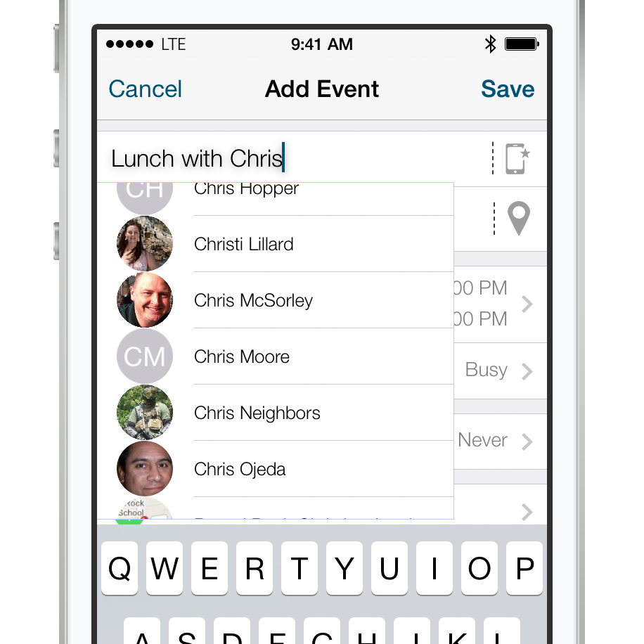 SmartTitle is a new feature that we designed to make entering events and tasks easier. We’ve extended our inline-live location search to the title of an event/task to bring up your templates and contacts as well! Pick a contact and automatically get their phone number, address, or email inserted into the event/task so you can quickly tap on their links when viewing them to call, bring up a map, or send an email.