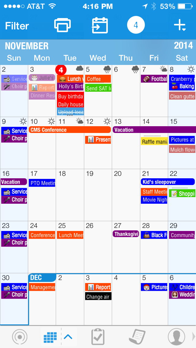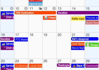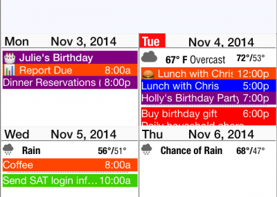 This unique digital format goes beyond the limitations of paper calendar visuals by allowing multi-day events to smoothly and visually cross months and give you a real sense of the week you are in. It also gives you the ability to have the current week at the top of the screen so you see more of your future events. And the best part is unlike other calendars that try to bring together months – you won’t get lost in what month you’re looking at.