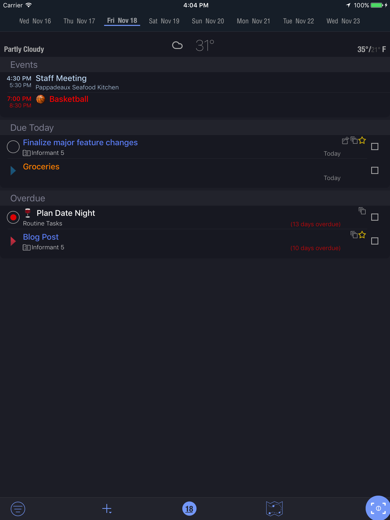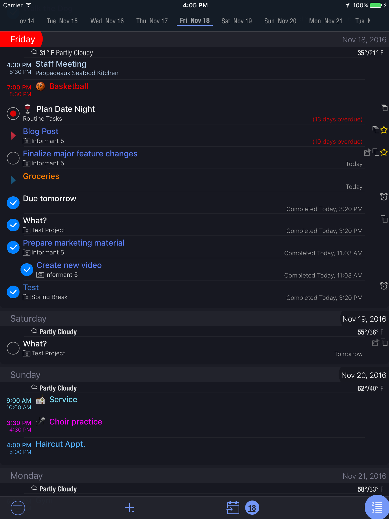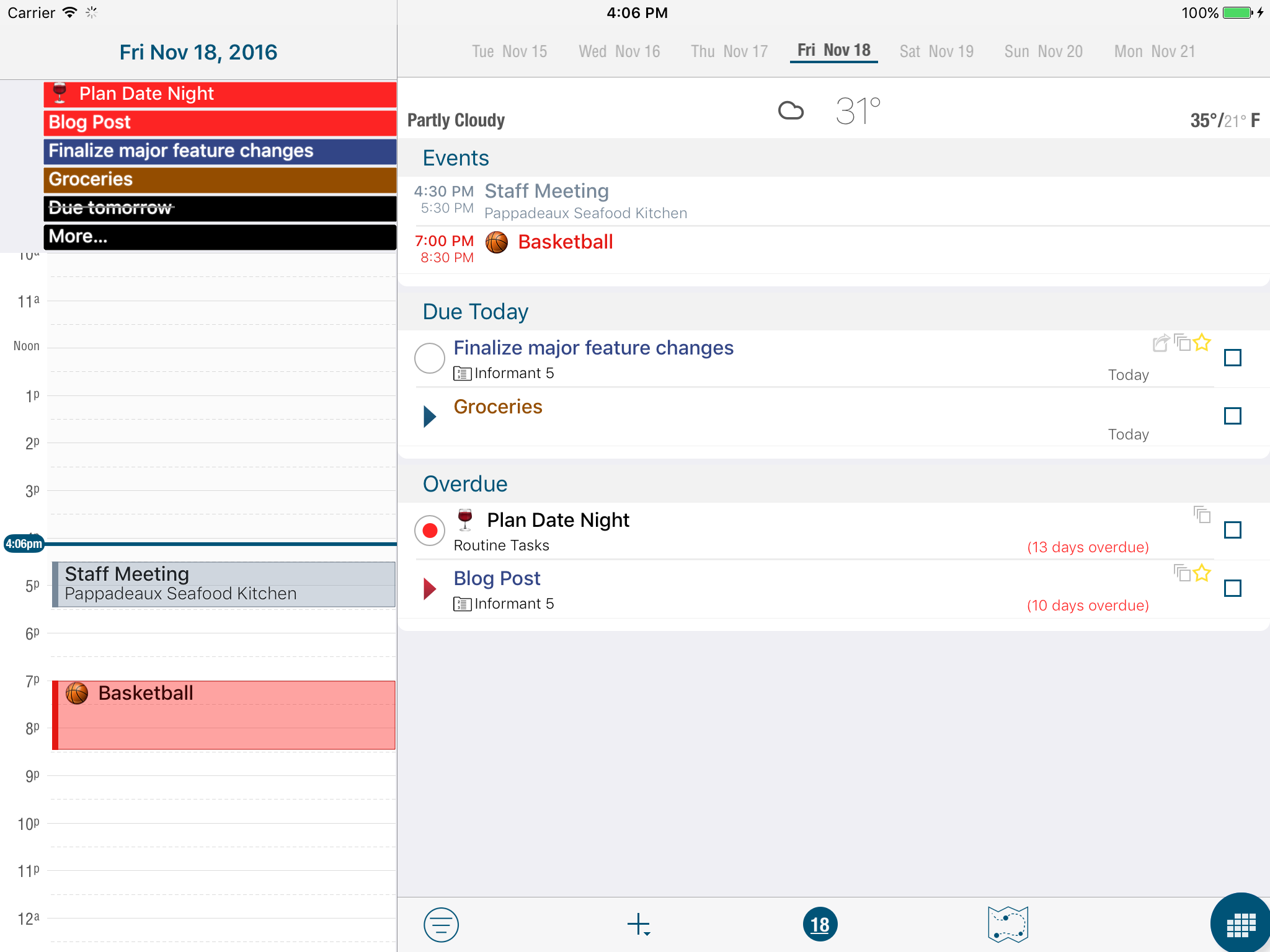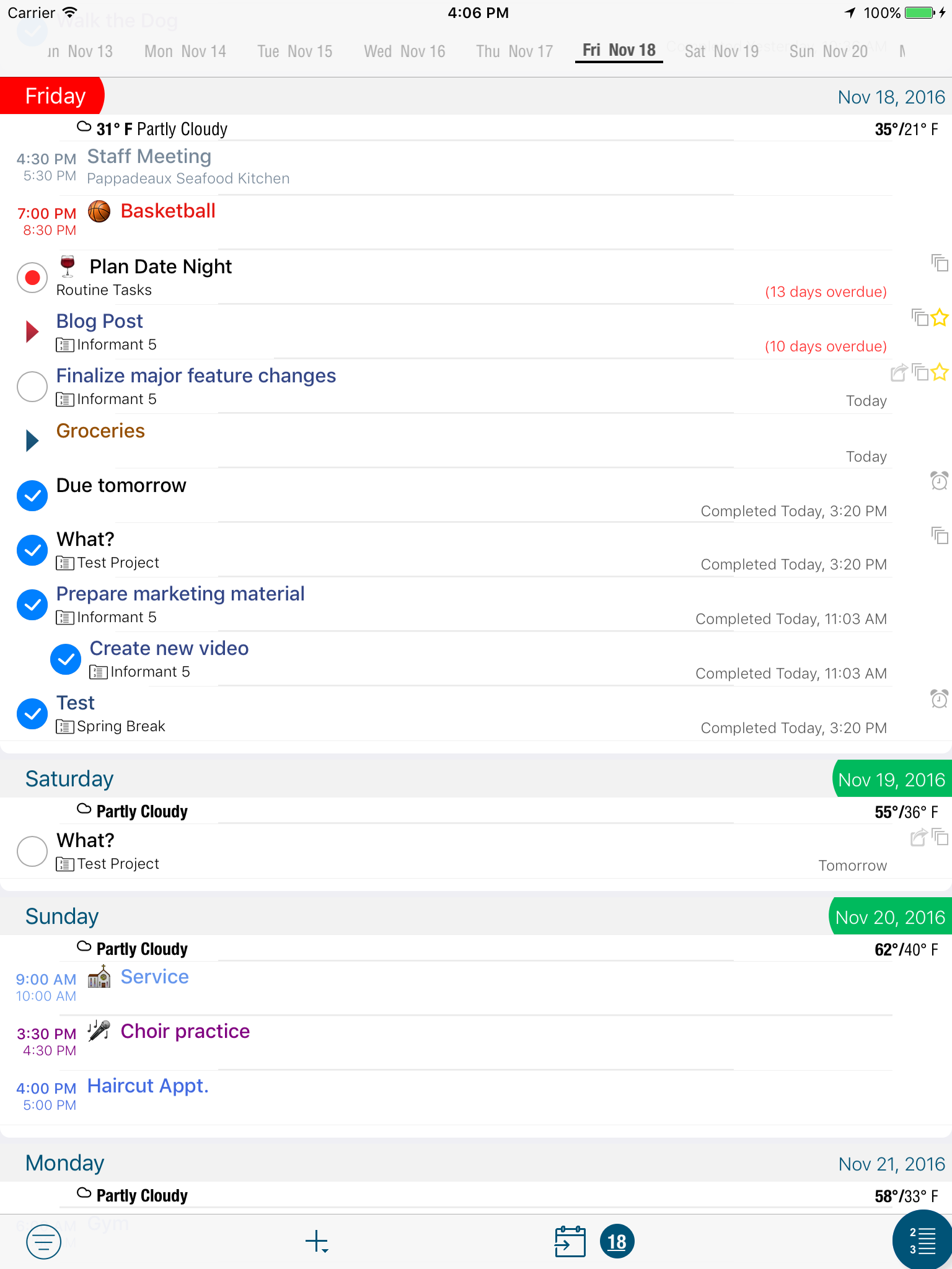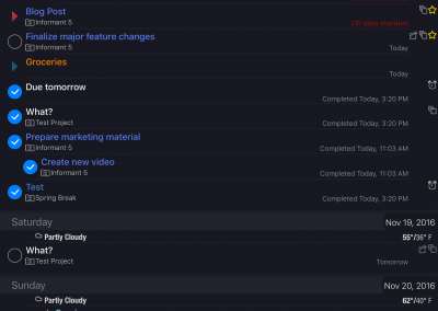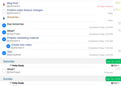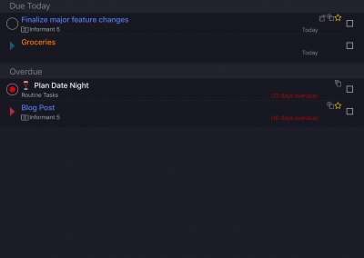 Organize tasks into projects. Tasks can have sub-tasks or checklists. Seamlessly integrates with your existing Apple reminders, or use Informant Projects for more robust features.
