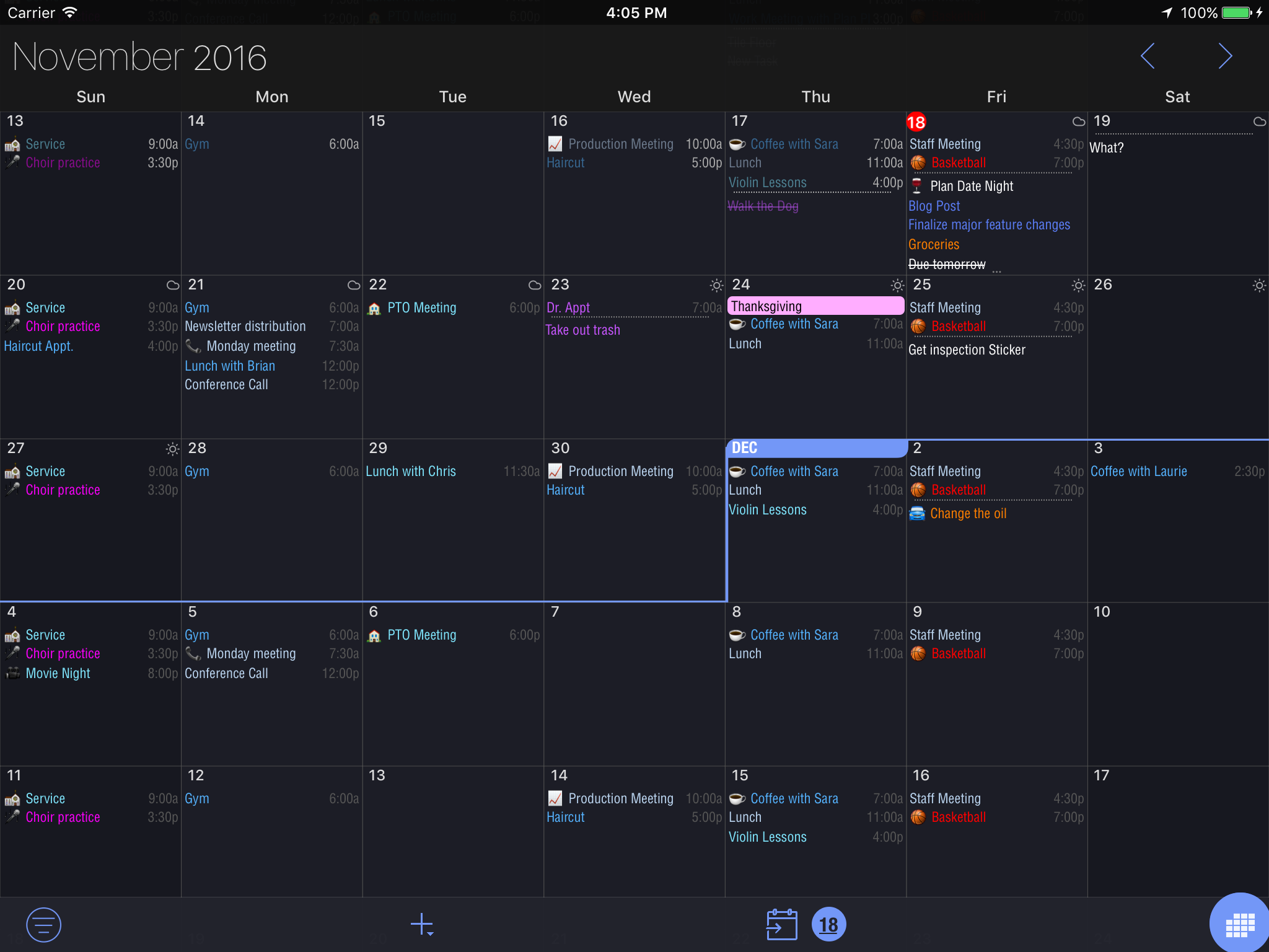 The Informant 5 Month View is far more functional than the default calendar month view. The default iOS calendar only gives you a dot if you have an appointment on a particular day. Our month view uses tiny-text to show the actual name and time of the event.